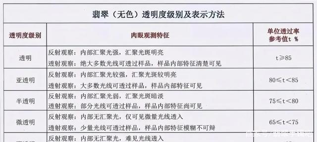 3.无色翡翠:透明度:根据翡翠(无色)透明度的差异,将其划分为五个等级。透明度级别由高到低依次表示为透明(T1)、亚透明(T2)、半透明(T3)微透明(T4)、不透明(T5)。